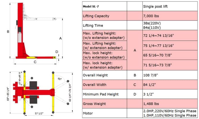 The APlusLift SL-7 Single Post Lift is a newly engineered lift perfect for small spaces, such as home garages, commercial shops, or any area where space-saving and durability are critical. With a 7,000-lb lifting capacity, this lift is ideal for quick vehicle lifts in limited space, providing both functionality and reliability.